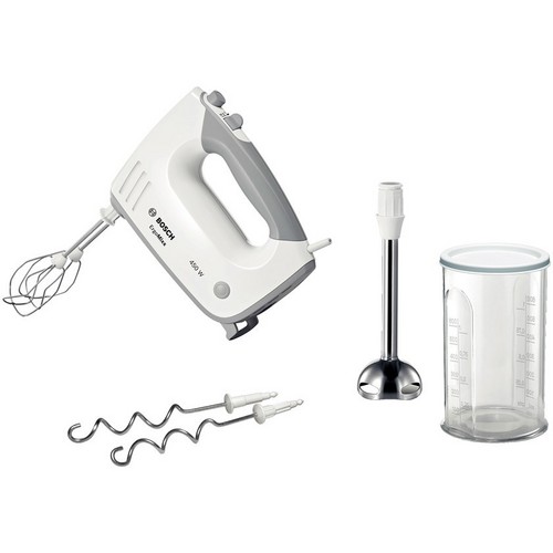 Mikser ręczny o mocy 450 W, z 5 stopniami prędkości, z funkcją pracy pulsacyjnej turbo, 2 końcówkami do ubijania, 2 hakami do ciasta, końcówką miksującą oraz pojemnikiem do miksowania z pokrywą